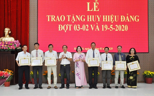 Ảnh: Đồng chí Trần Hoàng Khanh – Phó Ban Tổ chức Tỉnh ủy Kiên Giang và đồng chí Trang Thị Bích Ngọc – Phó Bí thư Thành ủy Rạch Giá trao huy hiệu 40 năm tuổi Đảng cho các đảng viên.