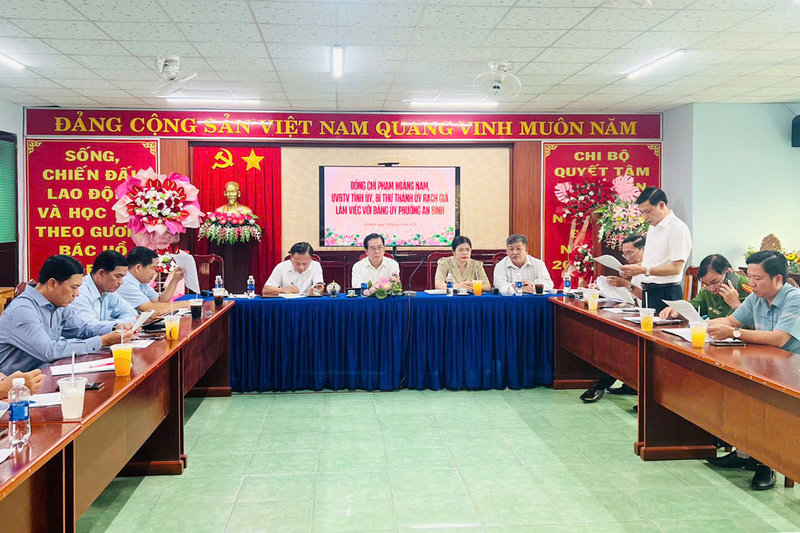 Ảnh: Lãnh đạo Đảng ủy phường An Bình đã báo cáo: Trong quý I/2025, tổng giá trị sản xuất trên toàn phường đạt 30,46% kế hoạch năm, trong đó giá trị sản xuất các ngành dịch vụ đạt 31%; giá trị sản xuất công nghiệp – xây dựng đạt 29%; giá trị sản xuất nông nghiệp - hải sản đạt 28%. Tổng thu ngân sách Nhà nước đạt 24,72% kế hoạch năm; quan tâm thực hiện tốt công tác an sinh xã hội, các chính sách đối với người có công, các đối tượng bảo trợ xã hội; công tác quốc phòng an ninh được giữ vững; chỉ đạo đẩy mạnh các hoạt động thực hiện phong trào thi đua yêu nước tại địa phương. Công tác xây dựng Đảng và hệ thống chính trị luôn được thực hiện khá tốt, đã tổ chức đầy đủ các Hội nghị triển khai, quán triệt, tuyên truyền và cụ thể hóa thực hiện các chủ trương, chỉ thị, nghị quyết của Đảng; các kế hoạch, chương trình hành động của cấp ủy cấp trên. Lãnh đạo các chi bộ trực thuộc thực hiện tốt công tác sinh hoạt Đảng, tỷ lệ cấp ủy chi bộ sinh hoạt đạt 98,2%; đảng viên tham gia sinh hoạt chi bộ đạt 90,3%; thường xuyên quan tâm công tác đào tạo, bồi dưỡng lý luận chính trị, chuyên môn cho cán bộ, đảng viên. Công tác kiểm tra, giám sát được Đảng ủy quan tâm thực hiện theo chương trình, kế hoạch đề ra; công tác chuẩn bị Đại hội Đảng bộ phường lần thứ XIV, nhiệm 2025-2030.