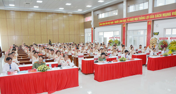 Ảnh: Đại biểu biểu quyết nhất trí Nghị quyết đại hội đại biểu Đảng bộ Công an thành phố Rạch Giá, nhiệm kỳ 2020-2025.