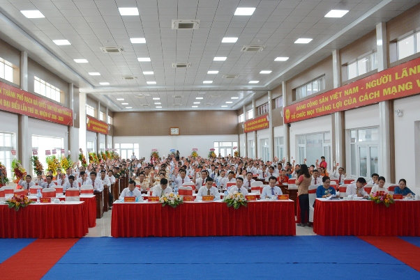 Ảnh: Đại biểu biểu quyết thống nhất Nghị quyết Đại hội đại biểu Đảng bộ thành phố Rạch Giá khóa XII, nhiệm kỳ 2020-2025