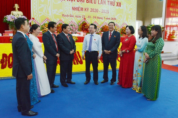 Ảnh: Đồng chí Nguyễn Thanh Nghị - Ủy viên Ban Chấp hành Trung ương Đảng, Bí thư tỉnh ủy, Trưởng Đoàn đại biểu Quốc hội đơn vị tỉnh Kiên Giang (thứ năm phải qua) trao đổi với dại biểu tại Đại hội Đảng bộ Đảng bộ thành phố Rạch Giá khóa XII, nhiệm kỳ 2020-2025