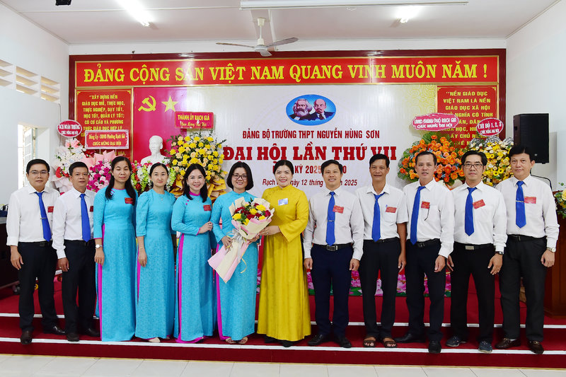 Ảnh: Đồng chí Nguyễn Thị Hoàn Xuân, Phó Bí thư Thành ủy Rạch Giá – Tổ trưởng Tổ Chỉ đạo đại hội các chi, đảng bộ cơ sở nhiệm kỳ 2025-2030 (thứ bảy trái qua) trao tặng hoa chúc mừng Ban Chấp hành Đảng bộ Trường Trung học phổ thông Nguyễn Hùng Sơn lần thứ VII, nhiệm kỳ 2025-2030