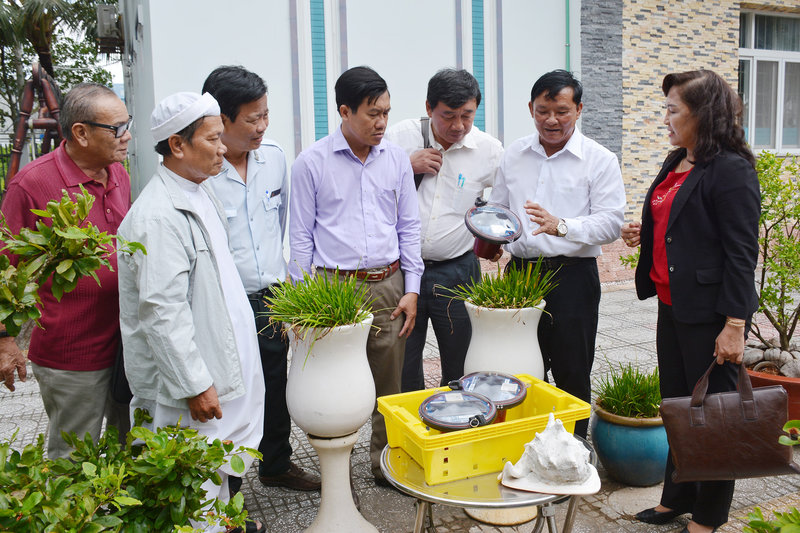 Ảnh: Bà Nguyễn Thị Kim Bé – Tỉnh ủy viên, Phó Trưởng đoàn chuyên trách Đoàn đại biểu Quốc hội tỉnh Kiên Giang (thứ nhất bên phải) lắng nghe ông Trương Văn Ngữ - Chủ tịch Hội Nghề cá thành phố Rạch Giá (thứ hai bên phải qua) nói về công năng của thiết bị giám sát hành trình tàu cá.
