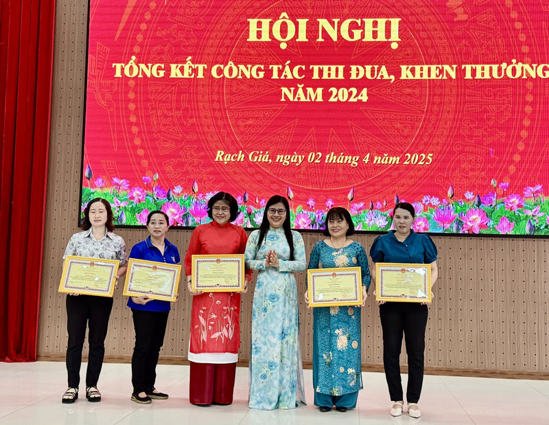 Ảnh: Đồng chí Nguyễn Thị Hồng Linh, Thành ủy viên - Phó Chủ tịch Ủy ban nhân dân thành phố (thứ 3 bên phải qua) trao Bằng khen của Ủy ban nhân dân Tỉnh Kiên Giang cho tập thể, cá nhân đã có thành tích xuất sắc trong phong trào thi đua chuyên đề về công tác khuyến học, khuyến tài, xây dựng xã hội học tập năm 2024.