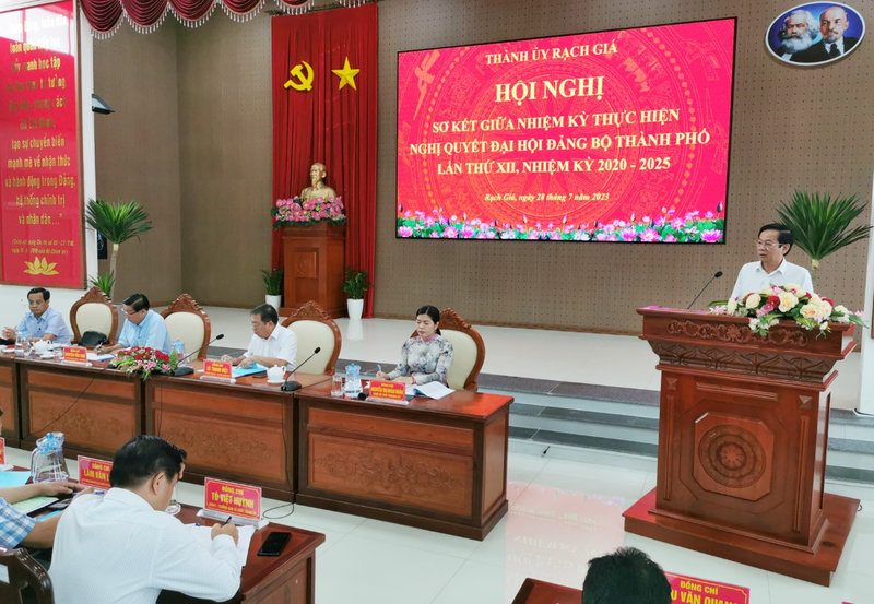 Tập thể Ban Thường vụ Thành ủy Rạch Giá chủ trì hội nghị có các đồng chí: Lê Thanh Việt - Ủy viên Ban Thường vụ Tỉnh ủy, Bí thư Thành ủy Rạch Giá; Nguyễn Văn Nhỏ - Phó Bí thư Thường trực Thành ủy, Chủ tịch Hội đồng nhân dân thành phố; Nguyễn Văn Hôn – Phó Bí thư Thành ủy, Chủ tịch Ủy an nhân dân thành phố và đồng chí Nguyễn Thị Hoàng Xuân – Phó Bí thư Thành ủy Rạch Giá.