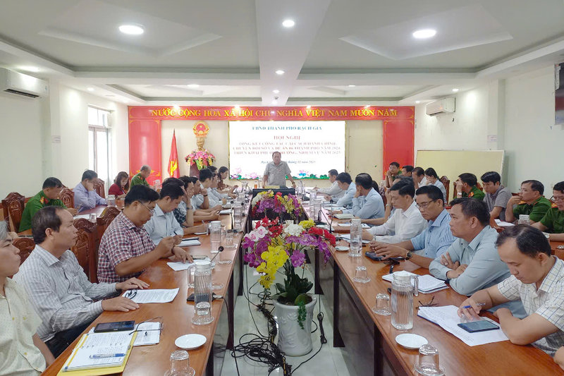 Ảnh: Hội nghị do ông Ngô Việt Trung - Phó Chủ tịch Ủy ban nhân dân thành phố chủ trì; với sự tham dự của lãnh đạo VNPT Kiên Giang, Chi nhánh Văn phòng đăng ký đất đai thành phố, Chi cục Thuế, Bưu điện thành phố, thành viên các Ban Chỉ đạo cải cách hành chính, Chuyển đổi số, Tổ công tác thực hiện Đề án 06 thành phố, lãnh đạo Ủy ban nhân dân và Trưởng Công an các phường, xã.