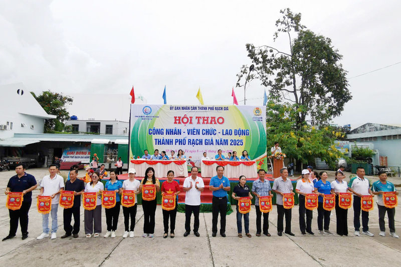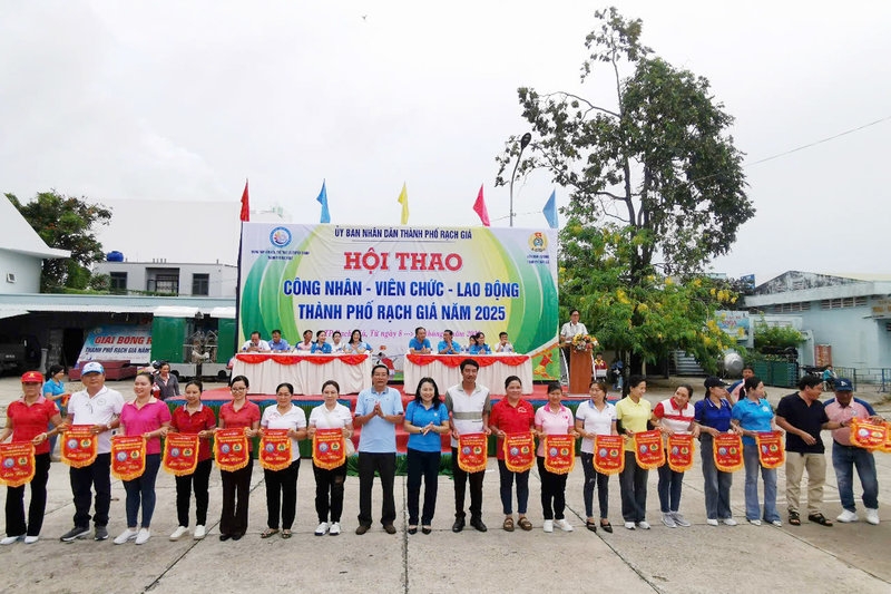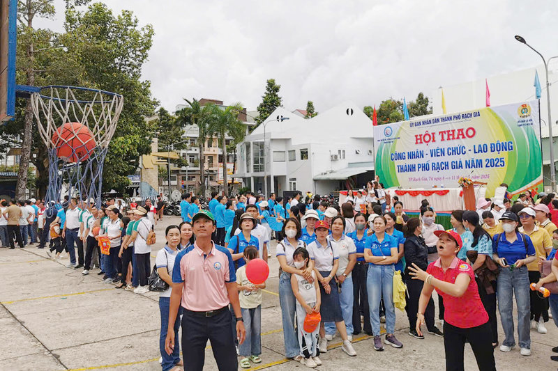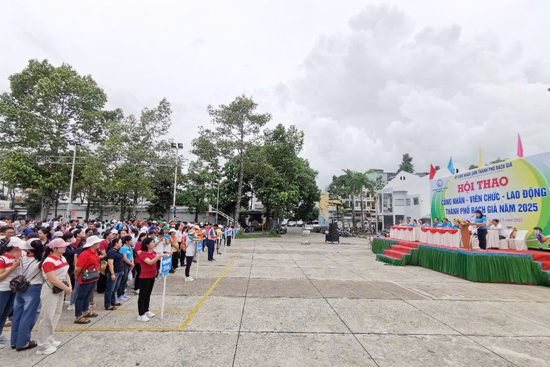 Ảnh: Toàn cảnh lễ khai mạc Hội thao công nhân viên chức lao động thành phố Rạch Giá năm 2025 tại Trung tâm Văn hóa thể thao và Truyền thanh thành phố.