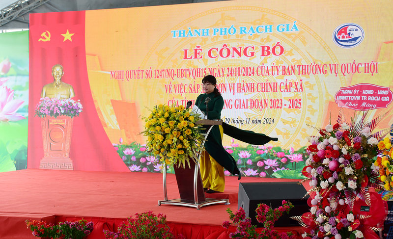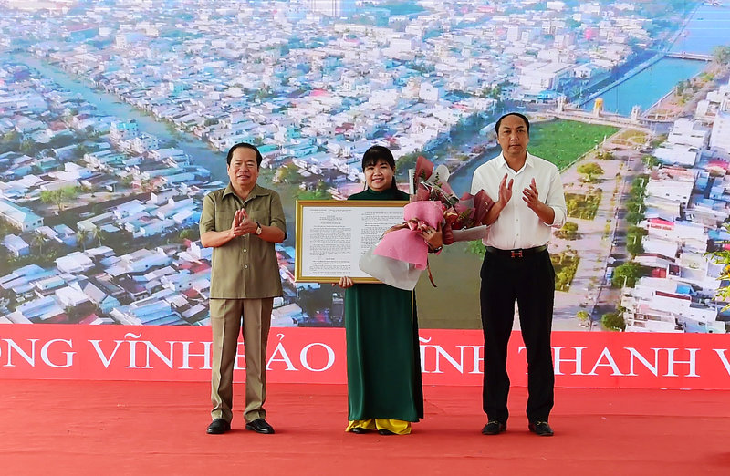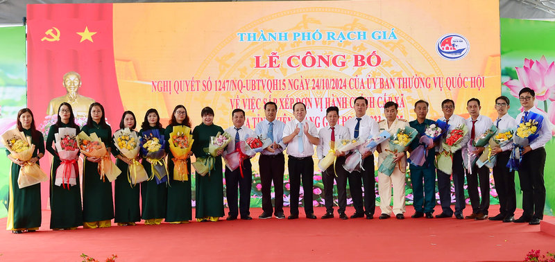 Ảnh: Đồng chí Mai Văn Huỳnh, Phó Bí thư Thường trực Tỉnh ủy, Chủ tịch Hội đồng nhân dân tỉnh (bên trái) và đồng chí Lâm Minh Thành, Phó Bí thư Tỉnh ủy, Chủ tịch Ủy ban nhân dân tỉnh Kiên Giang (bên phải) trao Nghị quyết số 1247 của Ủy ban Thường vụ Quốc hội và tặng hoa chúc mừng cho đồng chí Phạm Thị Bích Quyên, Bí thư Đảng ủy, Chủ tịch Hội đồng nhân dân phường Vĩnh Thanh Vân tiếp nhận