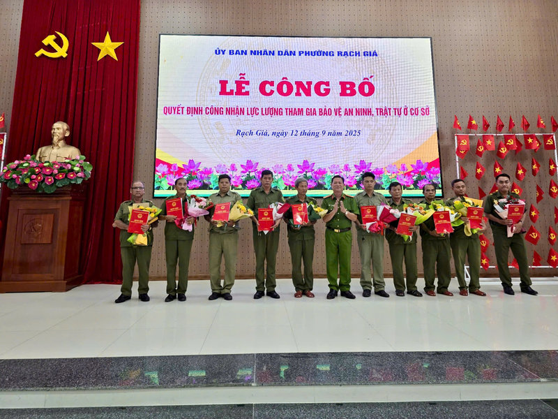Sáng ngày 12/9/2025, tại Hội trường Đảng ủy phường Rạch Giá, UBND phường đã tổ chức Lễ công bố Quyết định công nhận lực lượng tham gia bảo vệ an ninh, trật tự ở cơ sở. Tham dự buổi lễ có Đại tá Diệp Văn Thế - Phó Giám đốc Công an tỉnh An Giang; Đ/c Nguyễn Thị Hoàn Xuân - Phó Bí thư Thường trực Đảng ủy, Chủ tịch HĐND phường; Đ/c Bùi Trung Thực - Phó Bí thư Đảng ủy, Chủ tịch UBND phường Rạch Giá và Đ/c Phạm Thị Bích Quyên – Ủy viên Ban Thường vụ Đảng ủy, Phó Chủ tịch HĐND phường.