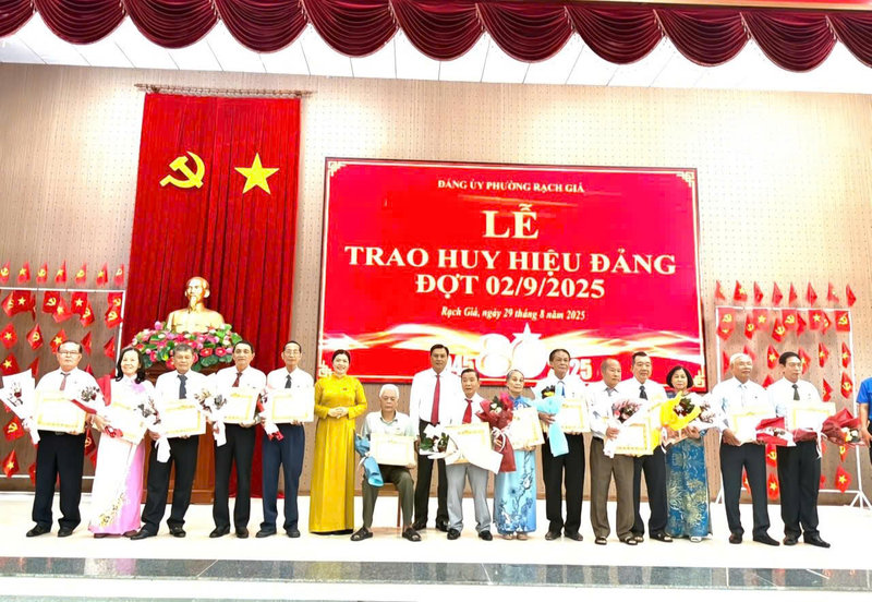 Nhân dịp kỷ niệm 80 năm Ngày Cách mạng Tháng Tám thành công (19/8/1945-19/8/2025) và Quốc khánh nước Cộng hòa xã hội chủ nghĩa Việt Nam (2/9/1945-2/9/2025), sáng ngày 29/8, Ban Thường vụ Đảng ủy phường Rạch Giá trang trọng tổ chức Lễ trao tặng huy hiệu Đảng đợt 2/9 cho các đảng viên cao niên tuổi Đảng đang sinh hoạt tại các chi bộ, đảng bộ trực thuộc. Đến dự lễ có đồng chí Nguyễn Thị Hoàn Xuân - Phó Bí thư Thường trực Đảng ủy, Chủ tịch HĐND phường; đồng chí Bùi Trung Thực - Phó Bí thư Đảng ủy, Chủ tịch UBND phường; các đồng chí Ủy viên Ban Thường vụ Đảng ủy; các đồng chí Bí thư chi bộ, đảng bộ trực thuộc Đảng ủy có đảng viên được nhận huy hiệu Đảng.