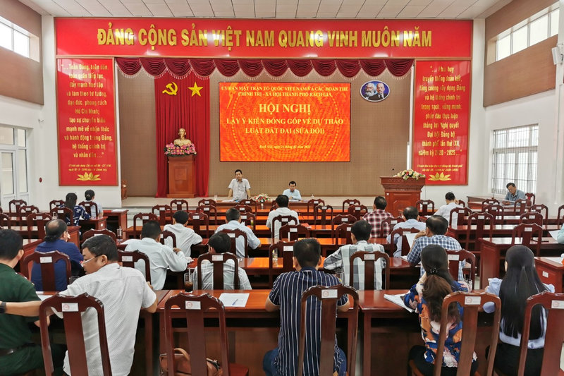 Đồng chí Lưu Văn Quang - Ủy viên Ban Thường vụ, Trưởng Ban Dân vận Thành ủy, Chủ tịch Ủy ban mặt trận tổ quốc Việt Nam thành phố Rạch Giá cho biết: Ngay trong tháng 2 và đầu tháng 3 năm 2023, Ủy ban mặt trận tổ quốc Việt Nam và các đoàn thể chính trị, xã hội thành phố Rạch Giá và 12 phường, xã tổ chức lấy ý kiến đóng góp dự thảo Luật Đất đai sửa đổi trong nội bộ và mở rộng đến người dân tại các khu dân cư trên địa bàn thành phố Rạch Giá./.
