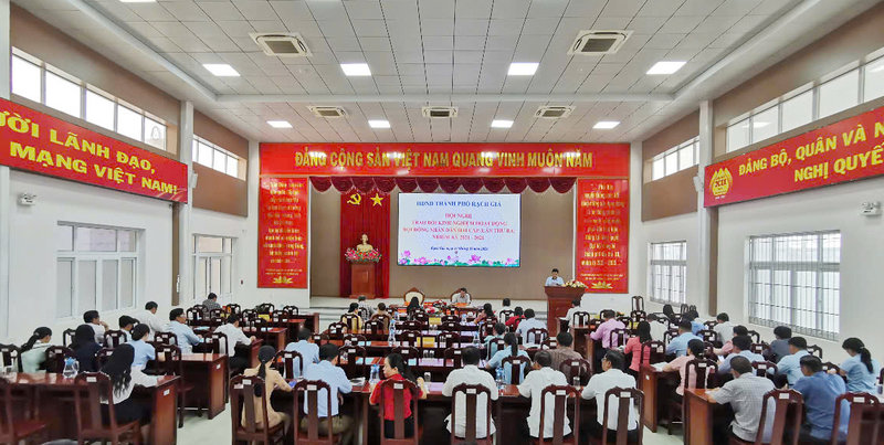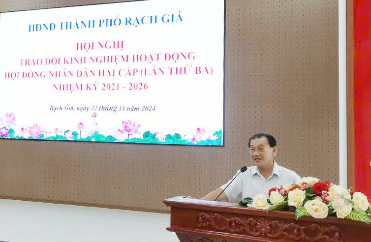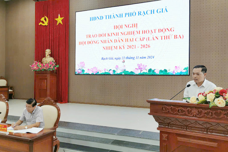 Ảnh: Toàn cảnh hội nghị trao đổi kinh nghiệm hoạt động của Hội đồng nhân dân cấp thành phố và phường, xã tại hội trường Thành ủy Rạch Giá