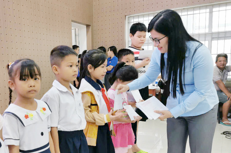 Ảnh: Ông Lại Tú Nguyên, Trưởng Phòng Y tế thành phố Rạch Giá (thứ 8 phải qua) trao học bổng cho các em
