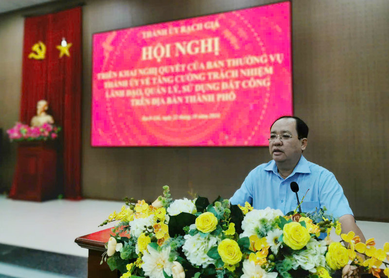Đồng chí Nguyễn Thanh Phong - Ủy viên Ban Thường vụ Tỉnh ủy, Bí thư Thành ủy Rạch Giá đã yêu cầu nội dung nghị quyết về tăng cường trách nhiệm lãnh đạo, quản lý, sử dụng đất công phải được quán triệt đến cán bộ, đảng viên, đoàn viên, hội viên và nhân dân nhằm tạo sự đồng thuận cao trong tổ chức thực hiện đạt hiệu quả, nhất là những chủ trương của Đảng, chính sách pháp luật Nhà nước về đất đai, cụ thể là Luật Đất đai năm 2023; giải pháp thực hiện phải khoa học, chặt chẽ, công khai, minh bạch, đúng quy hoạch, kế hoạch, đưa quỹ đất công trở thành nguồn lực quan trọng thúc đẩy sự phát triển kinh tế, xã hội của thành phố; Nghị quyết về đổi mới nâng cao chất lượng sinh hoạt chi bộ, sinh hoạt chuyên đề với yêu cầu phát huy đầy đủ vai trò, trách nhiệm của bí thư, phó bí thư chi bộ trong việc đổi mới nội dung, hình thức, tạo chuyển biến mạnh mẽ, thực chất về chất lượng, hiệu quả sinh hoạt chi bộ, sinh hoạt chuyên đề; nâng lên ý thức, trách nhiệm của đảng viên, tham gia xây dựng chi bộ trong sạch, vững mạnh góp phần nâng cao năng lực lãnh đạo, sức chiến đấu của chi bộ, xây dựng hệ thống chính trị ở cơ sở vững mạnh toàn diện./.