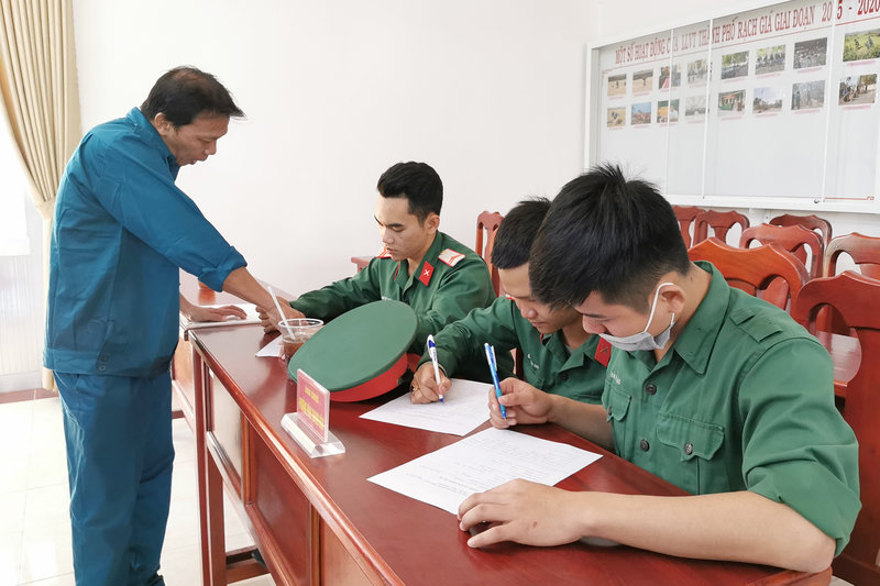 Ảnh: Trần Tấn Trung – Chiến sĩ thường trực Ban Chỉ huy quân sự phường Vĩnh Thanh Vân (đứng) hướng dẫn quân nhân xuấn ngũ năm 2021 ghi phiếu quân nhân dự bị.