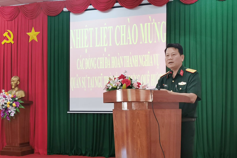 Ảnh: Trung tá Võ Thành Tiến – Ủy viên Ban Thường vụ Thành ủy, Chỉ huy trưởng Ban Chỉ huy quân sự thành phố Rạch Giá nói chuyện với quân nhân xuất ngũ tại hội trường Ban Chỉ huy quân sự thành phố Rạch Giá.