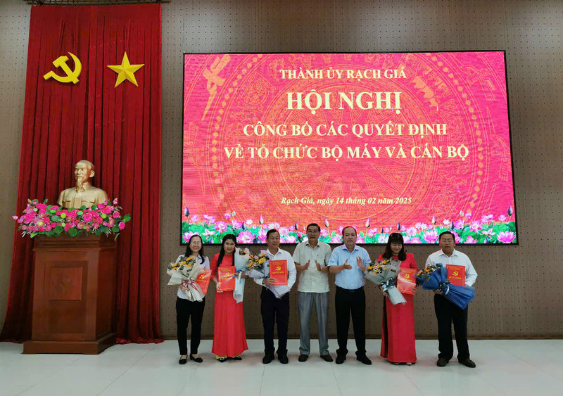 Ảnh: Đồng chí Nguyễn Thanh Phong, Ủy viên Ban Thường vụ Tỉnh ủy – Bí thư Thành ủy Rạch Giá (thứ ba phải qua) và đồng chí Nguyễn Văn Nhỏ, Phó Bí thư Thường trực Thành ủy, Chủ tịch Hội đồng nhân dân thành phố (thứ tư phải qua) trao quyết định của Ban Thường vụ Thành ủy và tặng hoa chúc mừng đối với các đồng chí được bổ nhiệm chức vụ mới