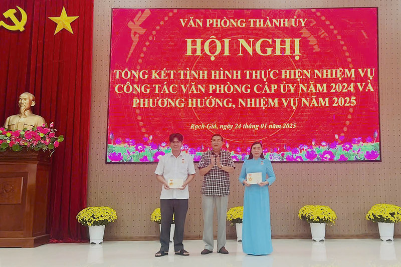 Ảnh: Đồng chí Danh Tài, Thành ủy viên, Chánh Văn phòng Thành ủy (thứ ba phải qua) trao tặng giấy khen cho 5 đồng chí đạt thành tích tốt trong thực hiện nhiệm vụ năm 2024; khen thưởng cho 4 cá nhân đạt thành tích xuất sắc trong thi đua chuyên đề Văn phòng cấp ủy năm 2024