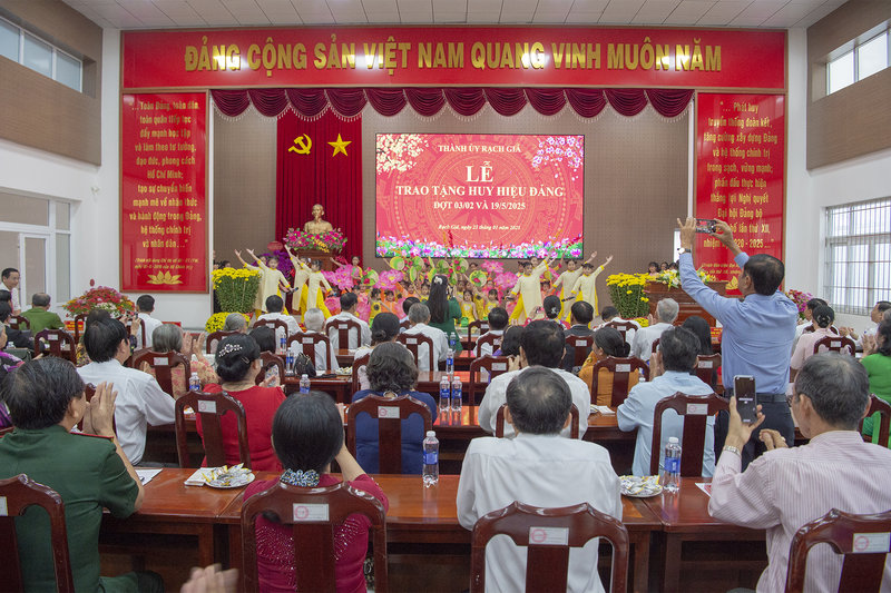 Ảnh: Chương trình Văn nghệ chào mừng Lễ trao Huy hiệu Đảng đợt 3 tháng 2 và 19 tháng 5 năm 2025 tại hội trường Thành ủy Rạch Giá