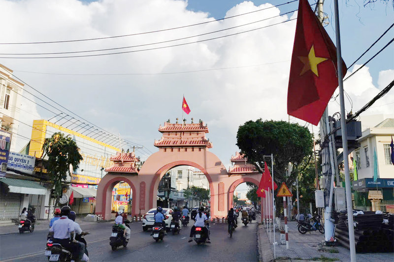 Ảnh: Ủy ban nhân dân phường Vĩnh Lạc treo Quốc kỳ dọc theo tuyến đường Nguyễn Trung Trực nội ô thành phố Rạch Giá.