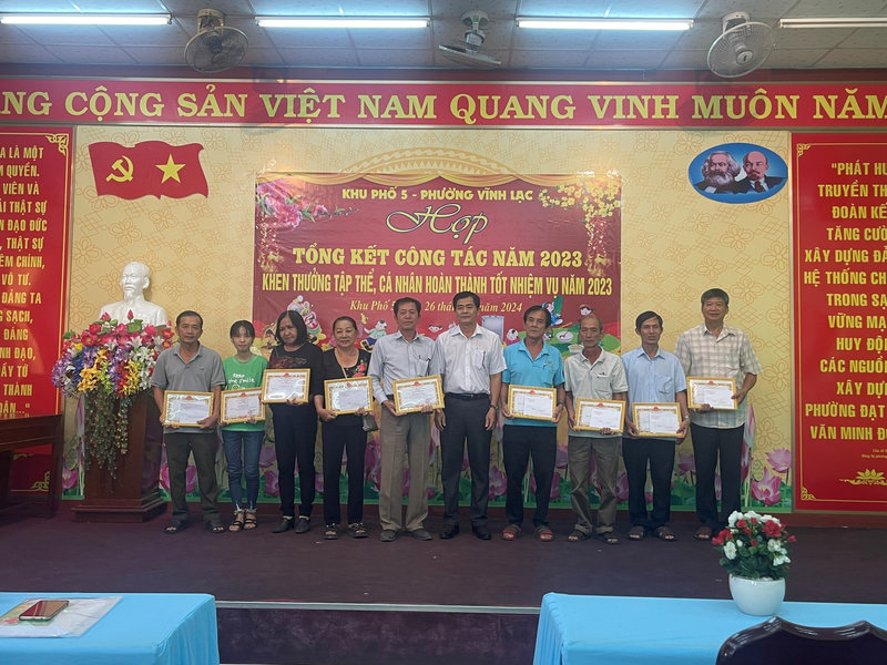 Hội nghị đã nghe trình bày dự thảo báo cáo công tác khu phố năm 2023 và phương hướng nhiệm vụ công tác khu phố năm 2024; đạt được nhiều thành tích đáng quan tâm, (trong đó: việc thu gom rác khu dân cư ngày càng tốt hơn, công tác thu phí vệ sinh được 1.070.155.000đ/960 triệu, đạt 107%; Hoàn thành công tác bình xét gia đình văn hóa năm 2023 và đăng ký các danh hiệu năm 2024, khu phố có 1.570/1.592 hộ đạt danh hiệu gia đình văn hóa, đạt 97,78 %, (có 22 hộ không đạt) năm 2023; Thực hiện kế hoạch của chi bộ, khu phố vận động nhân dân đóng góp kinh phí làm 165 cột cờ và treo cờ Tổ quốc trên các tuyến đường nhân các ngày Lễ, ngày Tết, (chọn tuyến đường 3/2 làm điểm), treo 180 đèn lồng nhân Lễ hội truyền thống kỷ niệm 155 năm ngày hy sinh Anh hùng dân tộc Nguyễn Trung Trực, Thực hiện chế độ chính sách đối với người có công (khu phố quản lý 54 hộ), phối hợp với các đoàn thể, hội, thăm và tặng quà các gia đình chính sách, người có công với 30 xuất quà trị giá 6.000.000 đồng,Vận động các mạnh thường quân, các nhà hảo tâm trên 3 tấn gạo và nhiều suất quà tặng cho hộ nghèo, cận nghèo và lực lượng khu phố, bình xét hộ nghèo, cận nghèo năm 2023, khu phố có 02 hộ nghèo, 04 hộ cận nghèo theo tiêu chí mới). Tại hội nghị thông qua quyết định khen thưởng của UBND phường cho 10 tập thể và13 cá nhân hoàn thành tốt nhiệm vụ năm 2023.