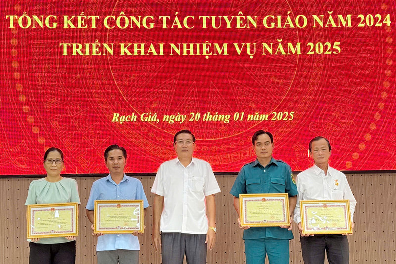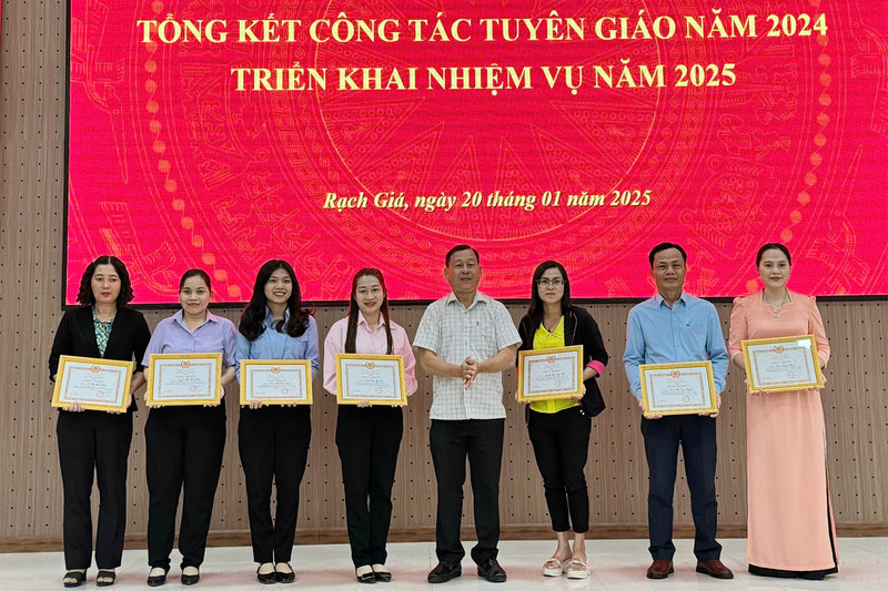 Ảnh: Đồng chí Lâm Văn Liêm, Ủy viên Ban Thường vụ Thành ủy, Trưởng Ban Tuyên Giáo- Giám đốc Trung tâm Chính trị thành phố (thứ ba từ phải qua) tặng Giấy khen của Ban Tuyên giáo Thành ủy cho các cá nhân có thành tích hoàn thành xuất sắc và hoàn thành tốt nhiệm vụ trong thực hiện công tác tuyên giáo năm 2024