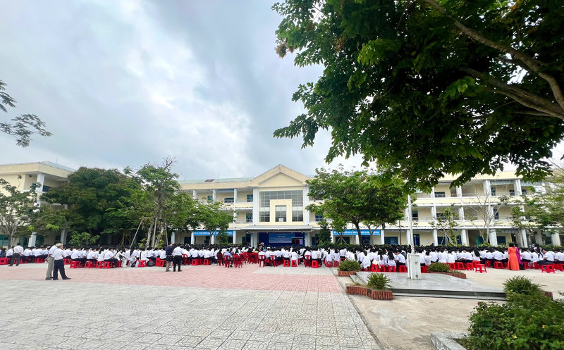 Ảnh: Toàn cảnh buổi tuyên truyền biển, đảo; thu hút nguồn nhân lực xây dựng quân chủng hải quân tại Trường Trung học phổ thông Nguyễn Trung Trực, thành phố Rạch Giá.